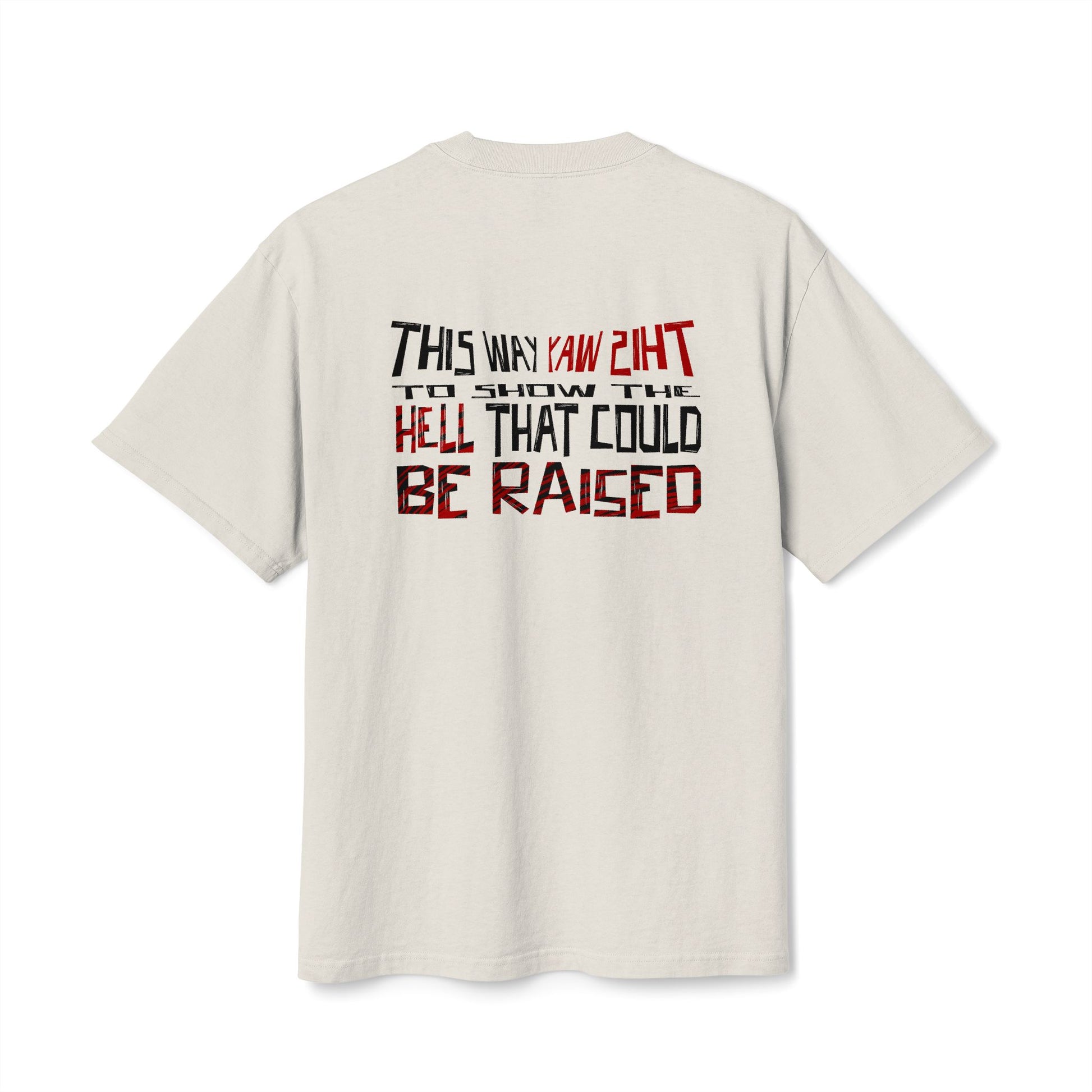 This heavyweight, boxy tee carries a worn-in edge and a bold attitude. Faded dye and distressed graphics give the shirt a lived-in look—like a rallying banner you’ve already broken in. The front features a compact, weathered logo with a swooping arrow; the back spreads a gritty, text-driven statement that reads like a manifesto. It settles onto the shoulders with a relaxed drape and sits roomy through the body, so it feels comfortable whether you're layered under a jacket or worn solo. Subtle details—twill shoulder tape, ribbed collar that keeps its shape, double-needle seams—mean this tee looks lived-in without falling apart. For adults who want something that reads rugged and authentic, this shirt leans into that raw, rebellious energy.
